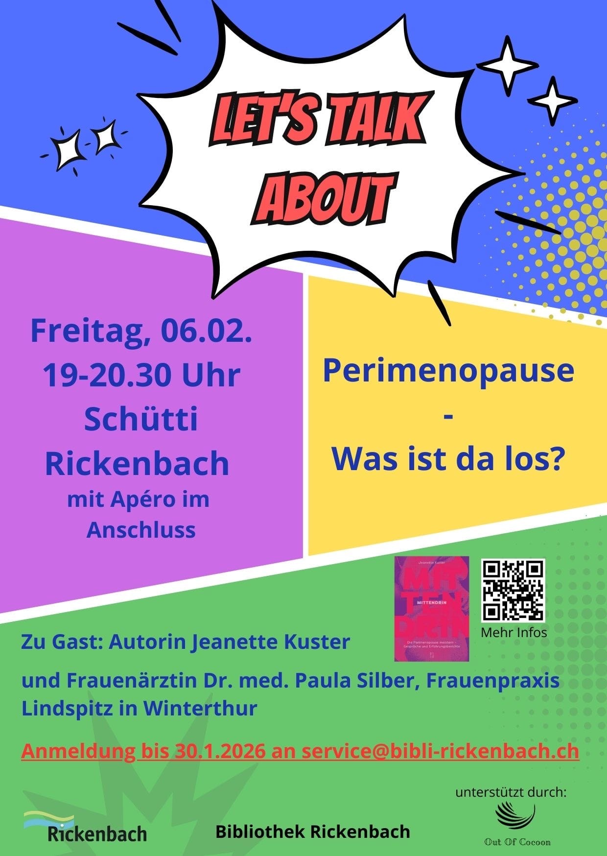 Ein informativer Abend zum Thema "Perimenopause" mit Platz für Fragen, Austausch, Begegnungen und Gespräche in entspannter Atmosphäre. Zu Gast: Jeanette Kuster, Menopause-Coach und Autorin des Buches "Mittendrin" sowie Dr. med. Paula Silber von der Frauenpraxis Lindspitz in Winterthur. Mit Apéro im Anschluss. Auch Männer sind herzlich willkommen.